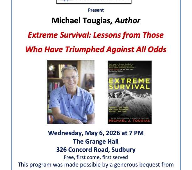 NewsSudbury Public Schools Superintendent Brad Crozier to Step Down at End of School YearByKevin LaHaise4 days ago EventsNY Times Bestselling Author Michael Tougias to Speak on Extreme SurvivalByContributor4 hours ago NewsSPS Committee Offers Interim Superintendent Role to Assistant SuperintendentByKevin LaHaise8 hours ago NewsPut May 4 Annual Town Meeting on Your CalendarByThe League of Women Voters of Sudbury1 day ago EventsSudbury Garden Club Annual Plant Sale – May 9ByContributor1 day ago EventsSudbury 250 DayByContributor1 day ago EventsIndigenous Origins – Sudbury Massachusetts: Sunday, April 26ByContributor1 day ago EventsOrder your Junior Prom Flowers From FELS!ByContributor1 day ago Features350 Years Ago…ByJan Hardenbergh1 day ago NewsSudbury Public Schools Awards Extended Day Contract to Sudbury Extended DayByKevin LaHaise1 day ago NewsRamen Haven Brings Authentic Japanese Cuisine to Sudbury’s Meadow WalkByKevin LaHaise2 days ago EventsReaders Selected for Production of Sinclair Lewis’ It Can’t Happen Here April 30ByContributor3 days ago FeaturesTHE BRIDGE THAT ‘YANKEES SUCK’ BUILTByNate Homan3 days ago FeaturesSudbury Food Pantry Expands Just as Need ExpandsByNancy Brumback4 days ago NewsSudbury Public Schools Superintendent Brad Crozier to Step Down at End of School YearByKevin LaHaise4 days ago NewsPlanning Board Supports Article Funding Sewataro Consultant ServicesByKevin LaHaiseApril 11, 2026 NewsSky Bar Proposed as State Chocolate BarByNancy BrumbackApril 10, 2026 EventsReading of Sinclair Lewis’ It Can’t Happen Here Planned for April 30ByContributorApril 10, 2026 EventsShower for Shelters Becomes Shower for SafetyByContributorApril 10, 2026