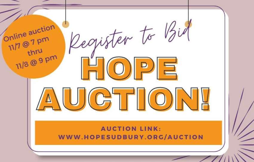 The HOPE Auction is HOPEsudbury's largest fundraiser. It funds giving programs, specifically the HOPEfund which provides direct bill for Sudbury residents who are facing financial difficulties. The auction opens Friday 11/7 @ 7pm and runs until 11/8 @ 9pm. Auction can be accessed through our website: www.hopesudbury.org/auction.