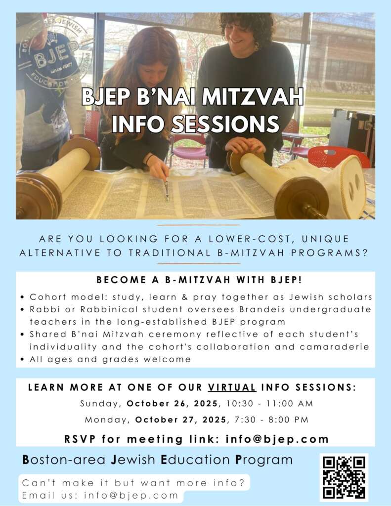 Are you looking for a lower-cost, unique alternative to traditional B-Mitzvah programs? Become a B-Mitzvah with BJEP! Learn more at one of our virtual info sessions:
