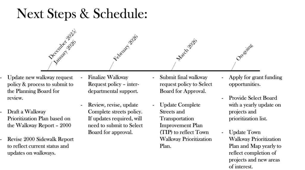 Notably, while it appeared to many residents as though the 2000 Walkway Report was never actioned upon, Rivard informed the board that the Town has completed five miles of the originally identified 16 miles of walkways since 2000. Moving forward, she informed the board the DPW would be taking the following actions: