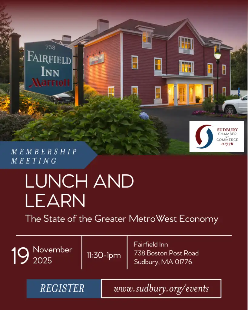 The State of the Greater MetroWest Economy will be presented at a November 19 Lunch and Learn event hosted by the Sudbury Chamber of Commerce. The meeting is open to all, and registration is required. Seats are limited, so prompt registration is recommended.