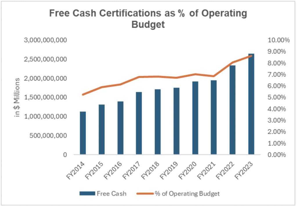 “Under sound financial policies, a community strives to generate free cash in an amount equal to five to seven percent of its annual budget. This goal helps deter free cash from being depleted in any particular year, which enables the following year’s calculation to begin with a positive balance. To do this, the community would orchestrate conservative revenue projections and departmental appropriations to produce excess income and departmental turn backs.”