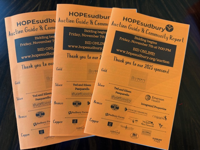 The HOPE Auction is HOPEsudbury’s largest fundraiser. It funds giving programs, specifically the HOPEfund which provides direct bill for Sudbury residents who are facing financial difficulties. The auction opens Friday 11/7 @ 7pm and runs until 11/8 @ 9pm. Auction can be accessed through our website: www.hopesudbury.org/auction.