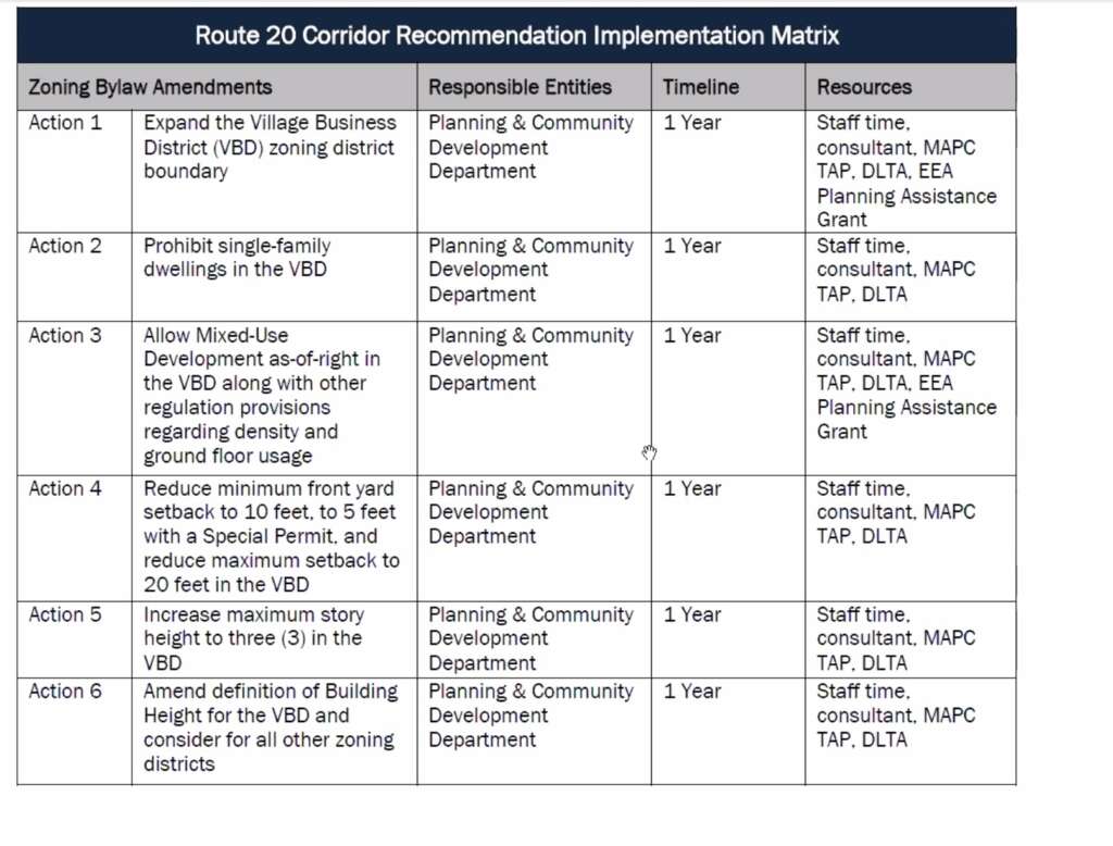 While a Special Town Meeting is expected in December of this year, the Planning Board has consistently opted to act deliberately and with precision rather than to rush bylaw amendments in recent years. With regard to the Route 20 Corridor Study, members have already expressed a desire to have robust communication with the community before taking action, making it more likely that any articles for bylaw amendments would come at the 2026 Annual Town Meeting at the earliest.