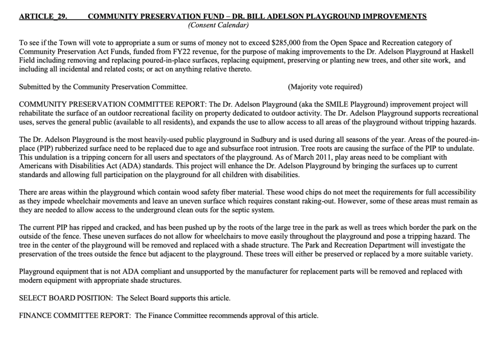While no commitments were made during the meeting, it did sound as though the Town could be proceeding with plans to install a temporary tent for shade in the playground, and might explore options for permanent shade structures with the remaining funds in the budget. The Park and Recreation Commission is exploring high-level cost estimates and funding sources to replace the now-removed play structure, too. However, that would likely be subject to a future appropriation at Town Meeting.