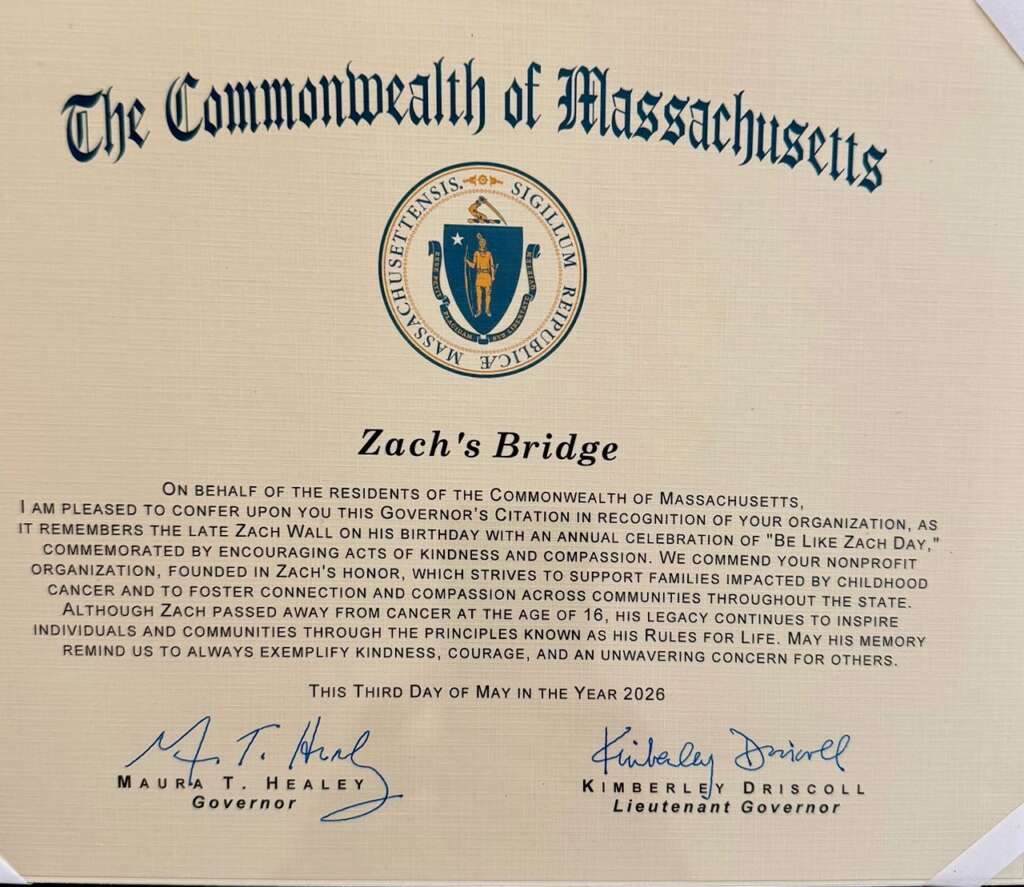 The Town’s official proclamation encourages all residents to observe the day by “performing acts of kindness, generosity and compassion in honor of Zach Wall.” The State of Massachusetts citation is below: