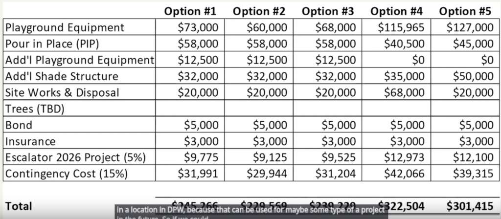 Garofalo presented a variety of playground equipment options and renderings, along with cost estimates. The Park and Recreation Commission will provide input on the final selections, though the preferences voiced in the meeting leaned towards two higher-priced options that could run north of $300,000.